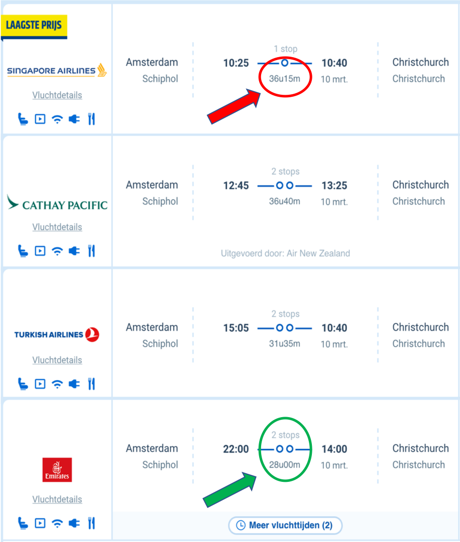 Zo kwamen wij uit bij onze concurrent: Emirates. Daarover horen wij overigens alleen maar goede verhalen, zeker als je business class reist. Je wordt zelfs met een taxi van huis opgehaald en weer thuisgebracht! ook bleek dat zij op de, voor ons, meest gunstige tijden vliegen om het maximaal aantal dagen in Nieuw-Zeeland te kunnen benutten: aankomst in de loop van de dag; vertrek in de avond.