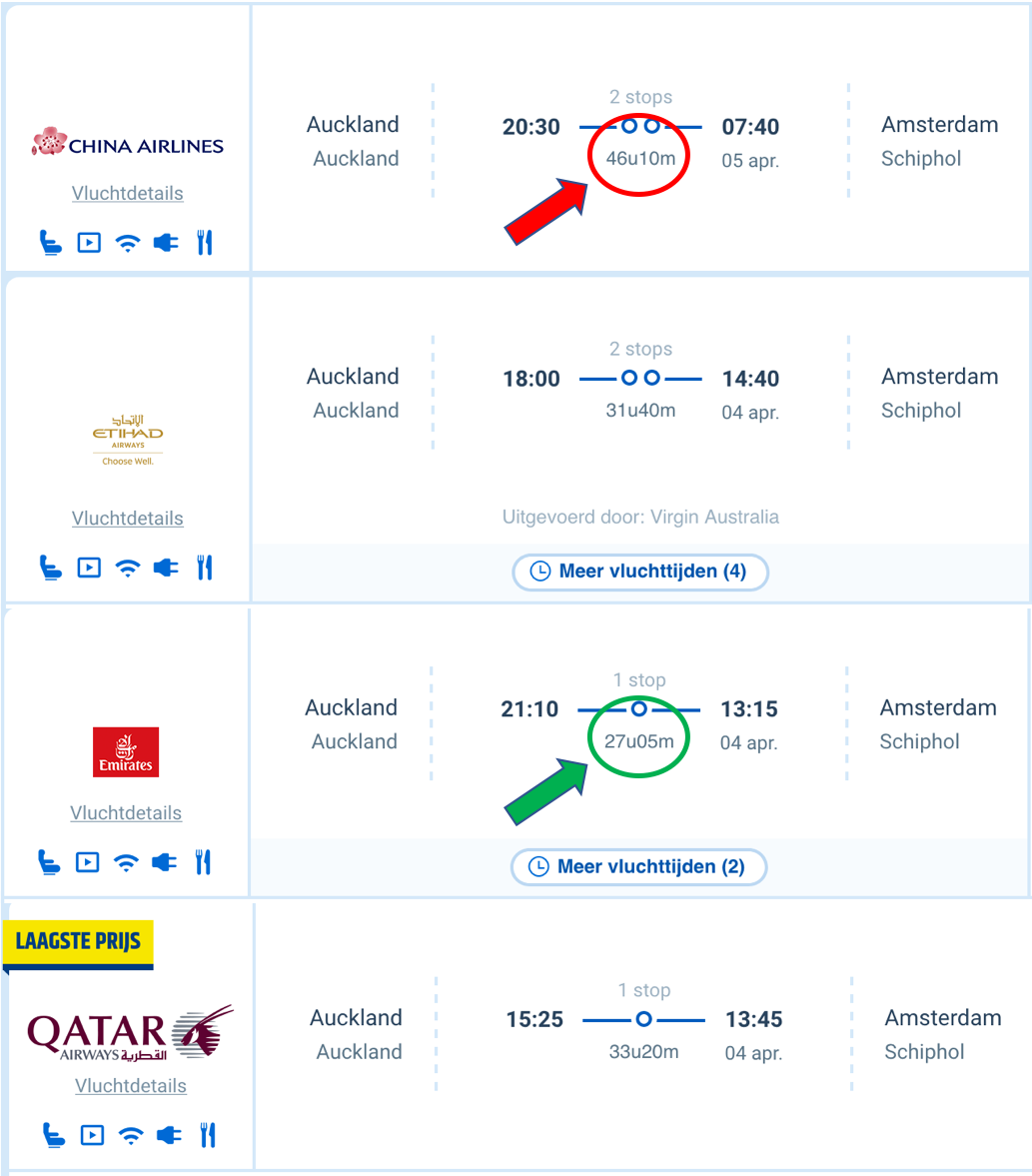 Alsof we voor ons werk nog niet genoeg in een vliegtuig zitten zullen we toch een afstand van zo'n 20.000km moeten overbruggen. Reden om dit toch zo comfortabel mogelijk aan te pakken; en de snelste verbinding te kiezen. Onderzoek leerde ons dat de totale vliegtijd varieert tussen zo'n 28 uur tot bijna 40 uur. Het idee dat je op verschillende luchthavens moet hangen; of voor een paar uur een hotelkamer huren stond ons niet aan. En dan hebben wij het nog niet over het tijdverschil van +11 uur tussen Nederland en Nieuw-Zeeland.