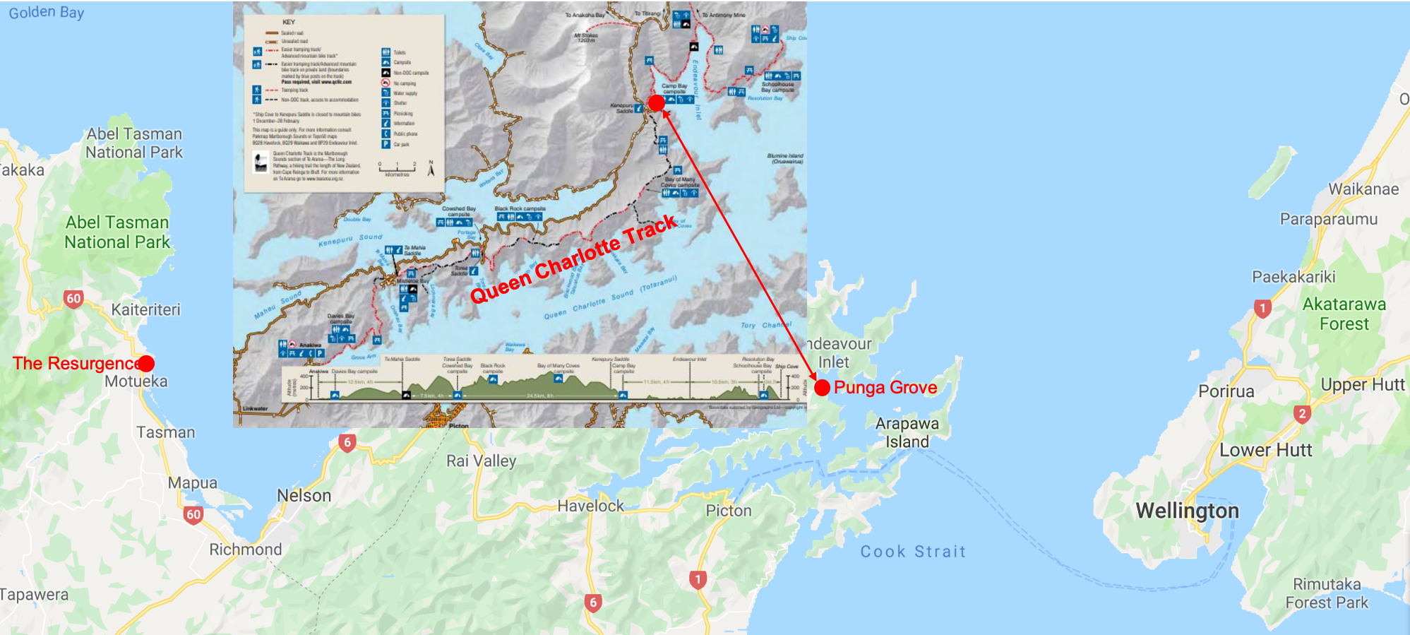 Nu we Abel Tasman National Park achter ons hebben gelaten gaan we naar onze laatste bestemming op het Zuider Eiland: het Punga Cove resort . Het resort ligt aan de Queen Charlotte Track. Deze scenic route door de Marlborough Sounds wordt aangeraden om (deels) te lopen of mountain biken; en schijnt veel weg te hebben van de Noorse fjorden. Het is hier alleen warmer, tropischer en misschien wel mooier. De Marlborough Sounds is een maritiem natuurpark met een oppervlakte van 960 vierkante kilometer en een labyrint van beboste bergen omgeven door water en eilanden. Er zijn talloze wandelpaden, veel wild en vogel-soorten, dolfijnen en pinguïns.